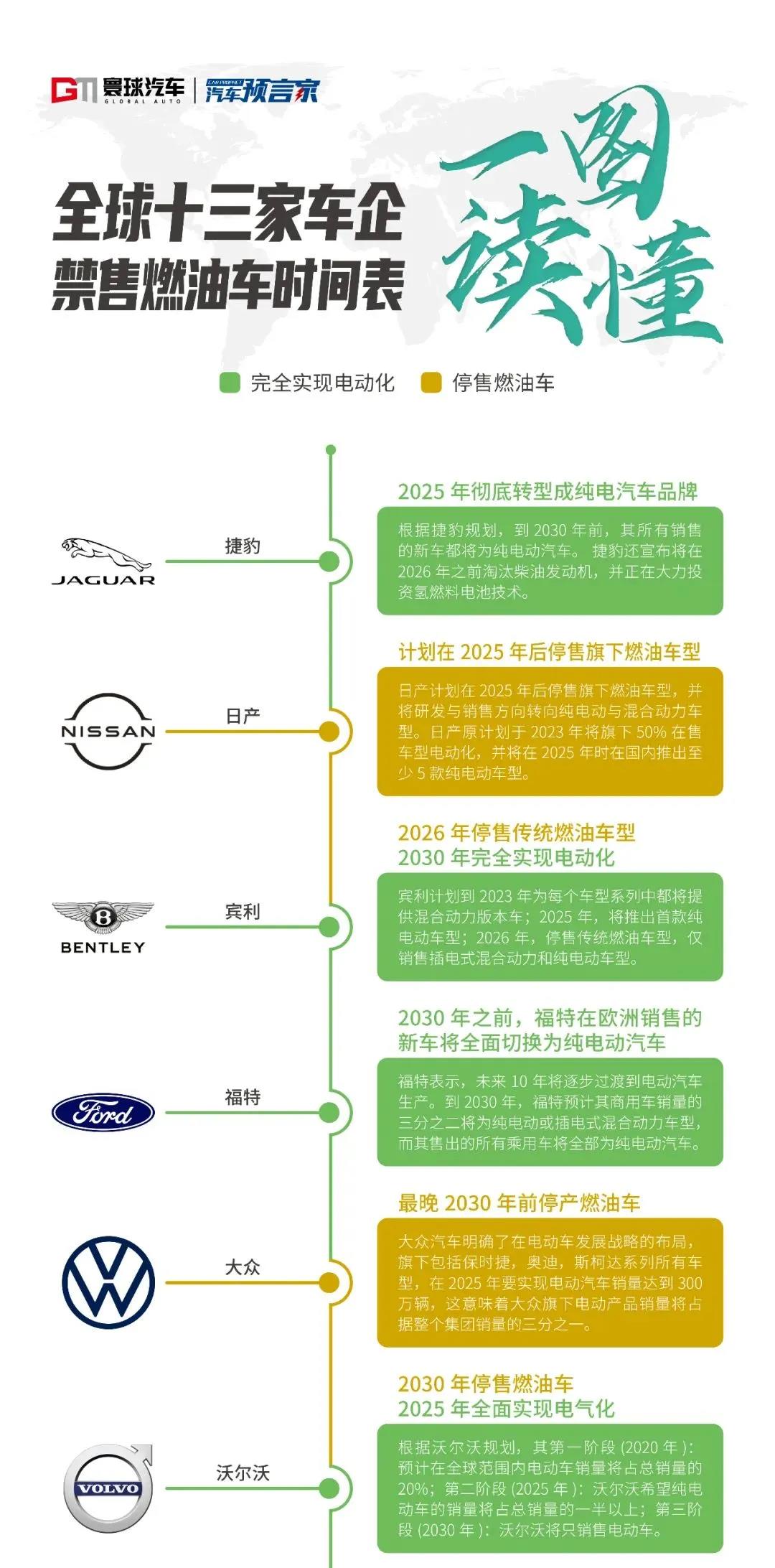 經(jīng)過汽車預(yù)言家梳理發(fā)現(xiàn),截至目前,已有8家跨國車企宣布停售或停產(chǎn)燃油車具體時(shí)間,有7家車企發(fā)布完全實(shí)現(xiàn)電動化的時(shí)間目標(biāo)。