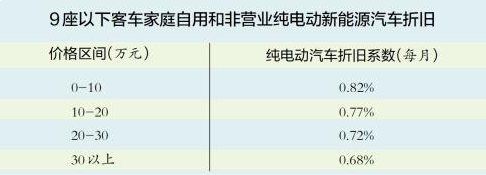 值得注意的是,征求意見稿中的9座以下客車家庭自用和非營業(yè)純電動新能源汽車折舊表有調(diào)整,不同車價(jià)的參考折舊系數(shù)均較現(xiàn)行條款0.6%的月折舊率有所提高,30萬元以上的車輛,折舊系數(shù)為0.68%/月,10萬元以下的車輛,折舊系數(shù)為0.82%/月。