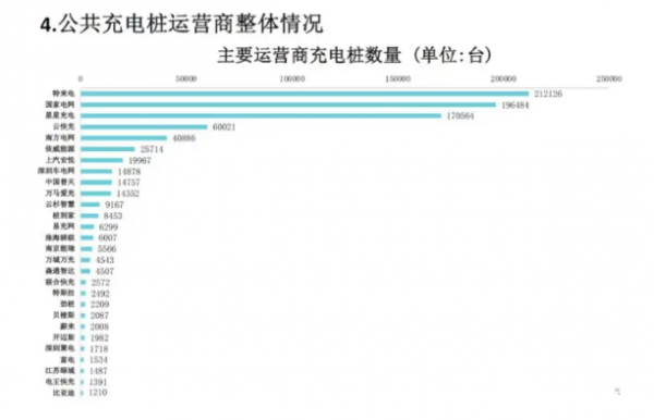 公在共充電基礎設施運營商方面,截止到2021年2月,全國充電運營企業(yè)所運營公共充電樁數(shù)量超過1萬臺的共有10家,分別為:特來電運營21.2萬臺、國家電網(wǎng)運營19.6萬臺、星星充電運營17.1萬臺、云快充運營6萬臺、南方電網(wǎng)運營4.1萬臺、依威能源運營2.6萬臺、上汽安悅運營2萬臺、深圳車電網(wǎng)運營1.5萬臺、中國普天運營1.5萬臺、萬馬愛充運營1.4萬臺。這10家運營商占總量的91.9%,其余的運營商占總量的8.1%。