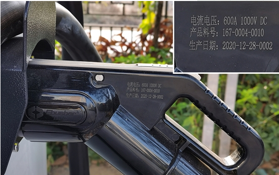 通過充電槍上的參數(shù)顯示,其電流和電壓分別為600A、1000V,通過計(jì)算可知該充電樁功率可達(dá)600kW。