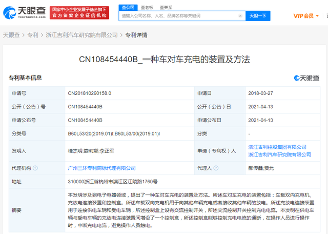 收藏本站 | 聯(lián)系我們4月13日,浙江吉利控股集團有限公司獲得一項名為“一種車對車充電的裝置及方法”的發(fā)明專利授權,公布號CN108454440B,申請日期為2018年3月,申請人為浙江吉利控股集團有限公司、浙江吉利汽車研究院有限公司。