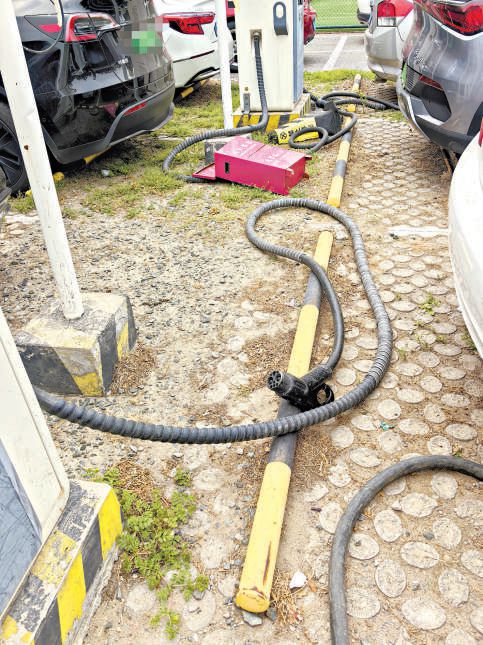 根據(jù)導(dǎo)航信息,記者又在朝陽(yáng)路附近一處停車場(chǎng)內(nèi)找到多個(gè)充電樁。從外觀來(lái)看,這些充電樁顯然有些破舊。其中,三臺(tái)充電樁雖說(shuō)有高大的柜體,但充電槍和黑色的線纜散落在地上,部分線纜還被倒下的滅火器箱壓住。充電柜旁,原本配備的攝像頭和相關(guān)組件也懸垂在半空中,僅靠一根細(xì)細(xì)的電線維系著。柜體正面,貼有多個(gè)不同品牌新能源汽車充電服務(wù)商的小程序二維碼。