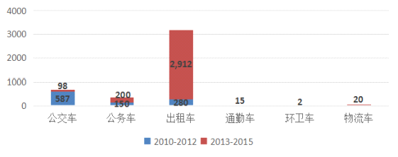 “十二五”期間,全省累計推廣應(yīng)用新能源汽車4,274輛。其中公交車695輛、出租車3,192輛(含分時租車2,500輛)、公務(wù)車350輛、通勤車15輛?環(huán)衛(wèi)車2輛、物流車20輛,如圖1所示。